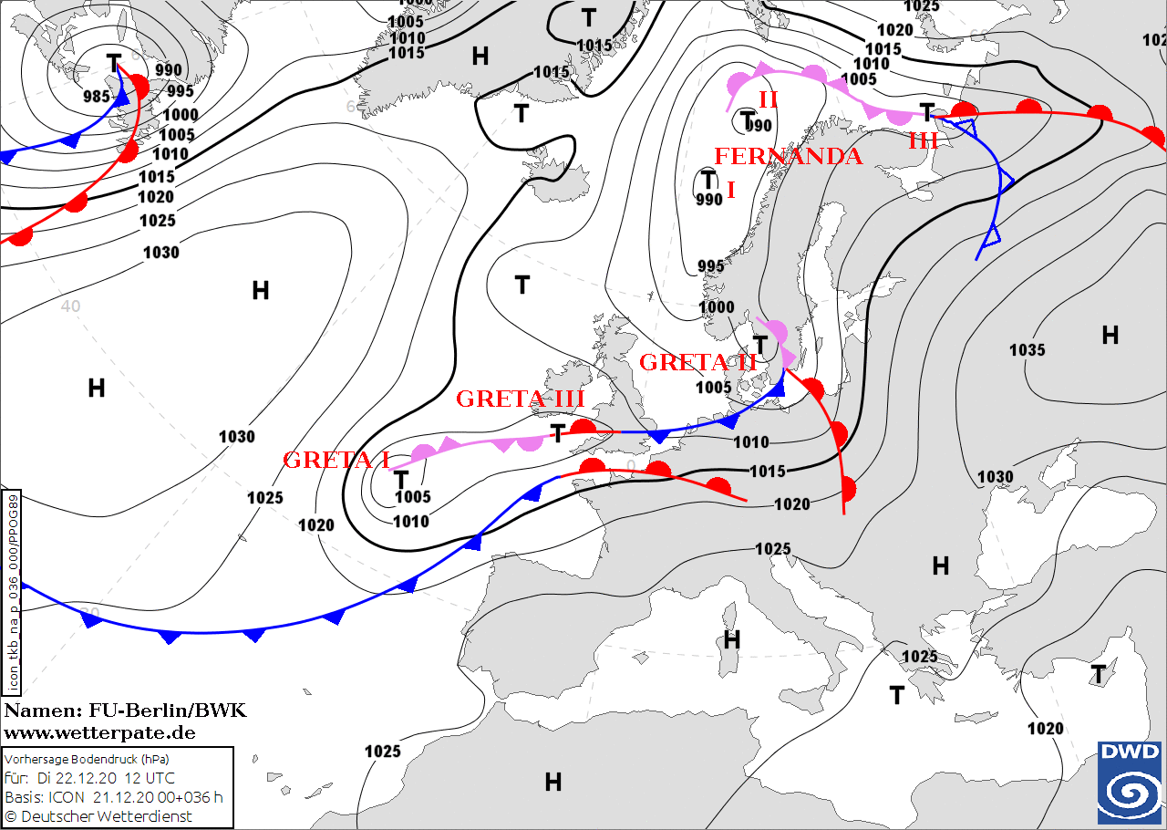 Noms des dépressions et anticyclones prévus pour mardi 22 décembre 2020 à midi (Berlin)