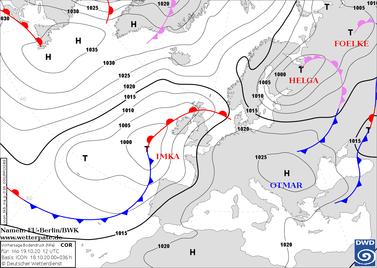 Noms des dépressions et anticyclones prévus pour lundi 19 octobre 2020 à midi (Berlin)